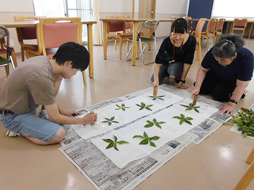 13:30 お楽しみクラブ(月)毎週月曜日は職員の企画した活動をしています。かんなの里 島野施設長による「お茶会クラブ」は大人気でした。※下記写真は藍染です。