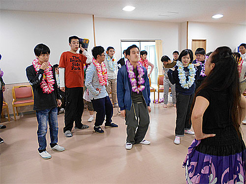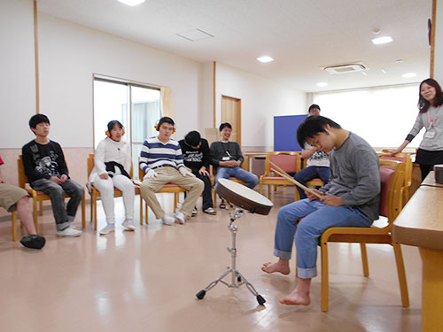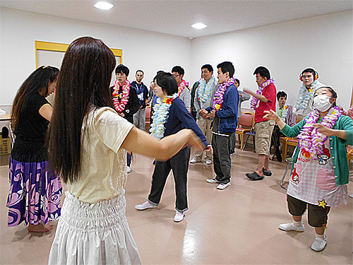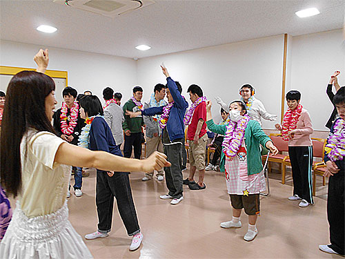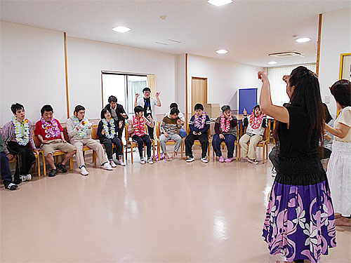 活動内容としては午前はさをり織り、自立課題、モチーナ等の作業活動中心ですが、午後は外出、絵画クラブ、映画会、音楽療法、フラダンス教室など利用者さんの楽しみとなるような活動を一人ひとりにあった参加の形で提供しています。